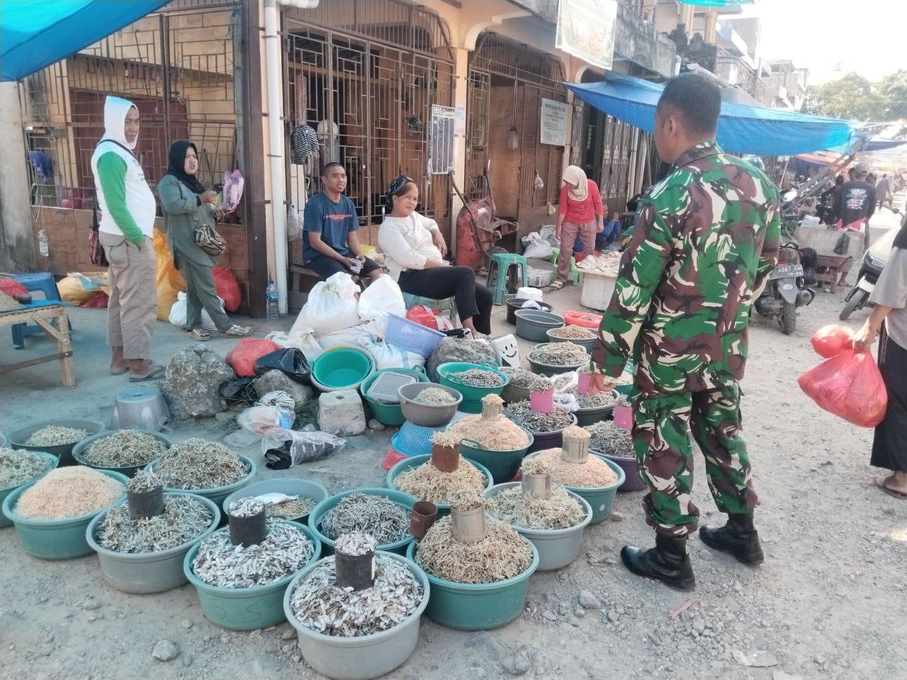 Sidrap – Babinsa Kelurahan Pangkajene, Koramil 03/Maritengngae, Sertu Suburhan melaksanakan kegiatan pemantauan ketersediaan dan harga bahan pokok di Pasar Sentral Pangkajene, Kelurahan Pangkajene, Kecamatan Maritengngae, Kabupaten Sidenreng Rappang (Sidrap), Senin, 21 Juli 2025