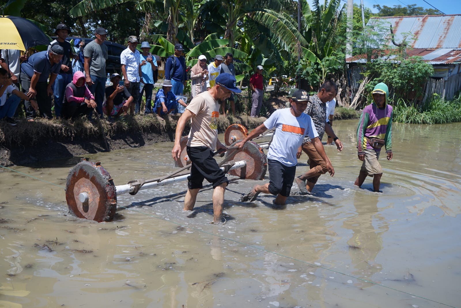 Tanpa canggung, Bupati Syaharuddin menggulung celana panjang dan menebar benih tanpa alas kaki. Aksinya disaksikan para petani, tokoh masyarakat, dan warga setempat.