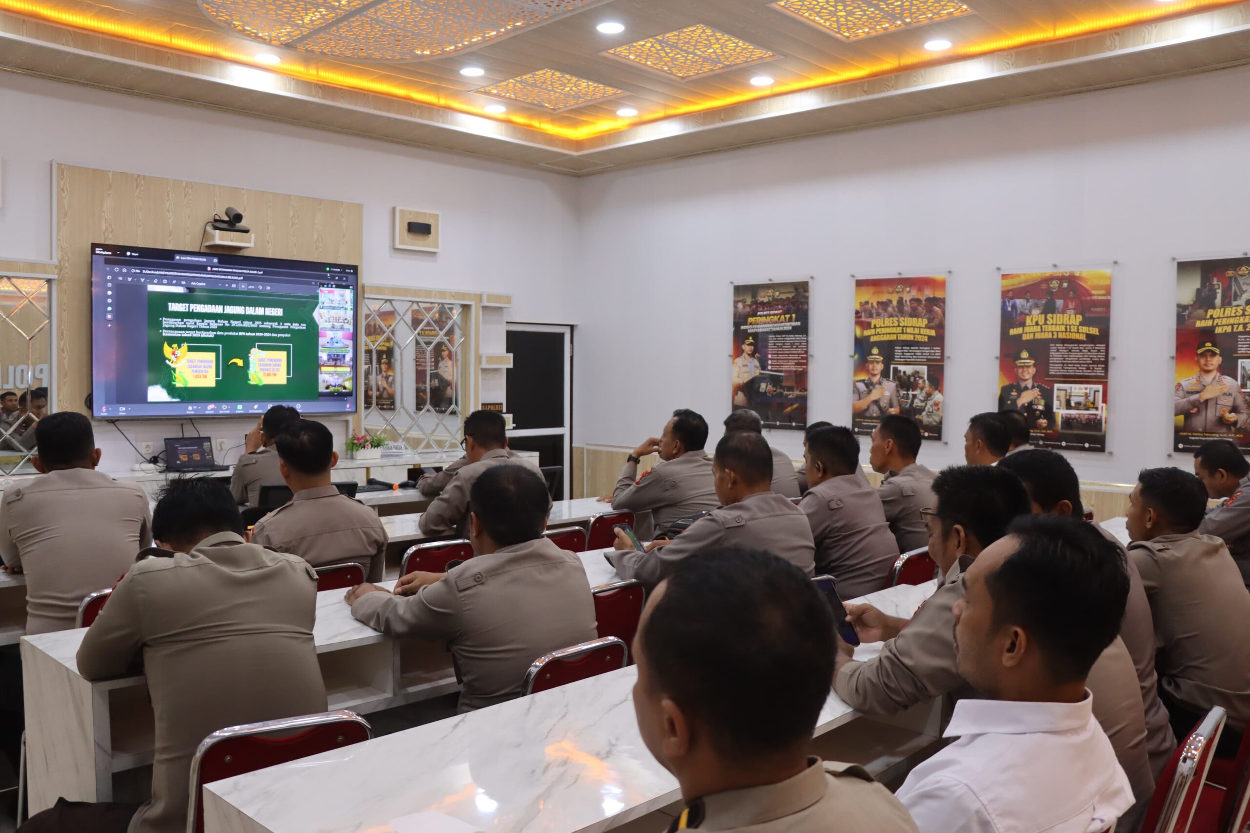 Sidrap – Wakapolres Sidrap Kompol Sulkarnain mengikuti kegiatan Zoom Meeting Analisa dan Evaluasi (Anev) Program Ketahanan Pangan Nasional, yang digelar secara serentak. Kegiatan ini membahas pencapaian target 1 juta ton jagung secara nasional, Senin (28/07/25) pagi