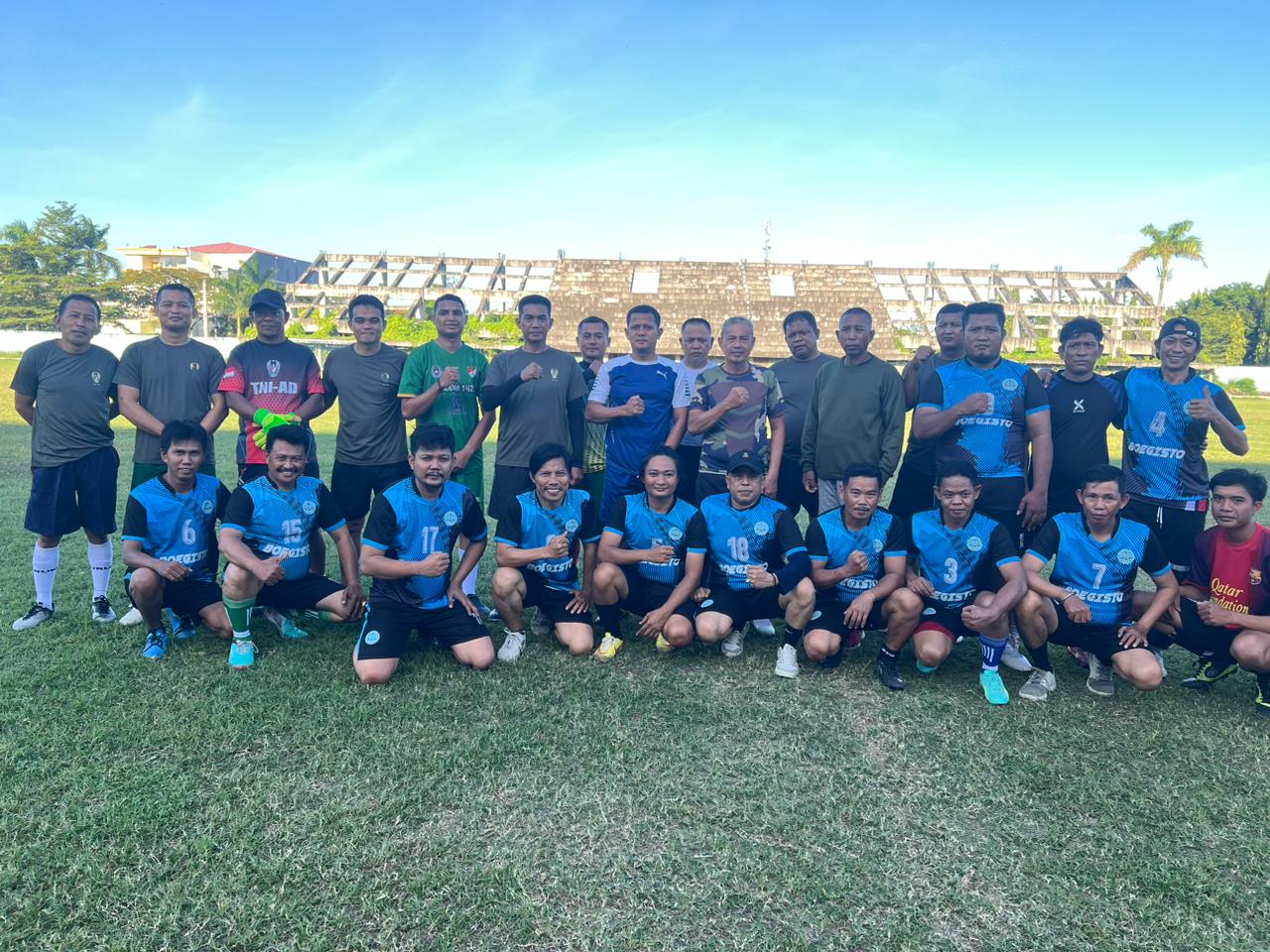 Sidrap — Pertandingan eksebisi antara PS Kodim 1420/Sidrap dan PS IWO Sidrap berlangsung seru di Stadion Ganggawa Pangkajene Sidrap, Jumat, (2/8/2024).
