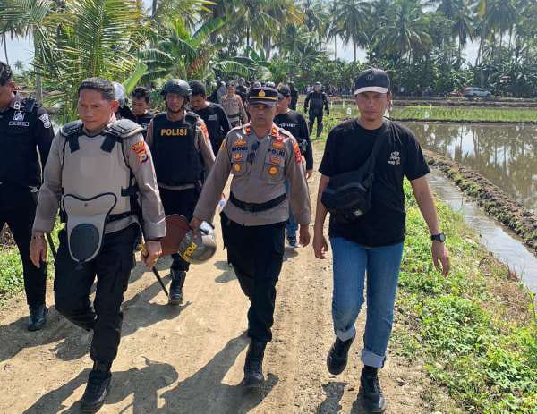 SIDRAP – Personel Polres Sidrap yang di back up oleh Batalyon B Pelopor Brimob Parepare turun langsung melakukan pengamanan eksekusi lahan di Desa Kalosi Alau Kec. Dua Pitue Kab. Sidrap. Selasa (25/6/2024).