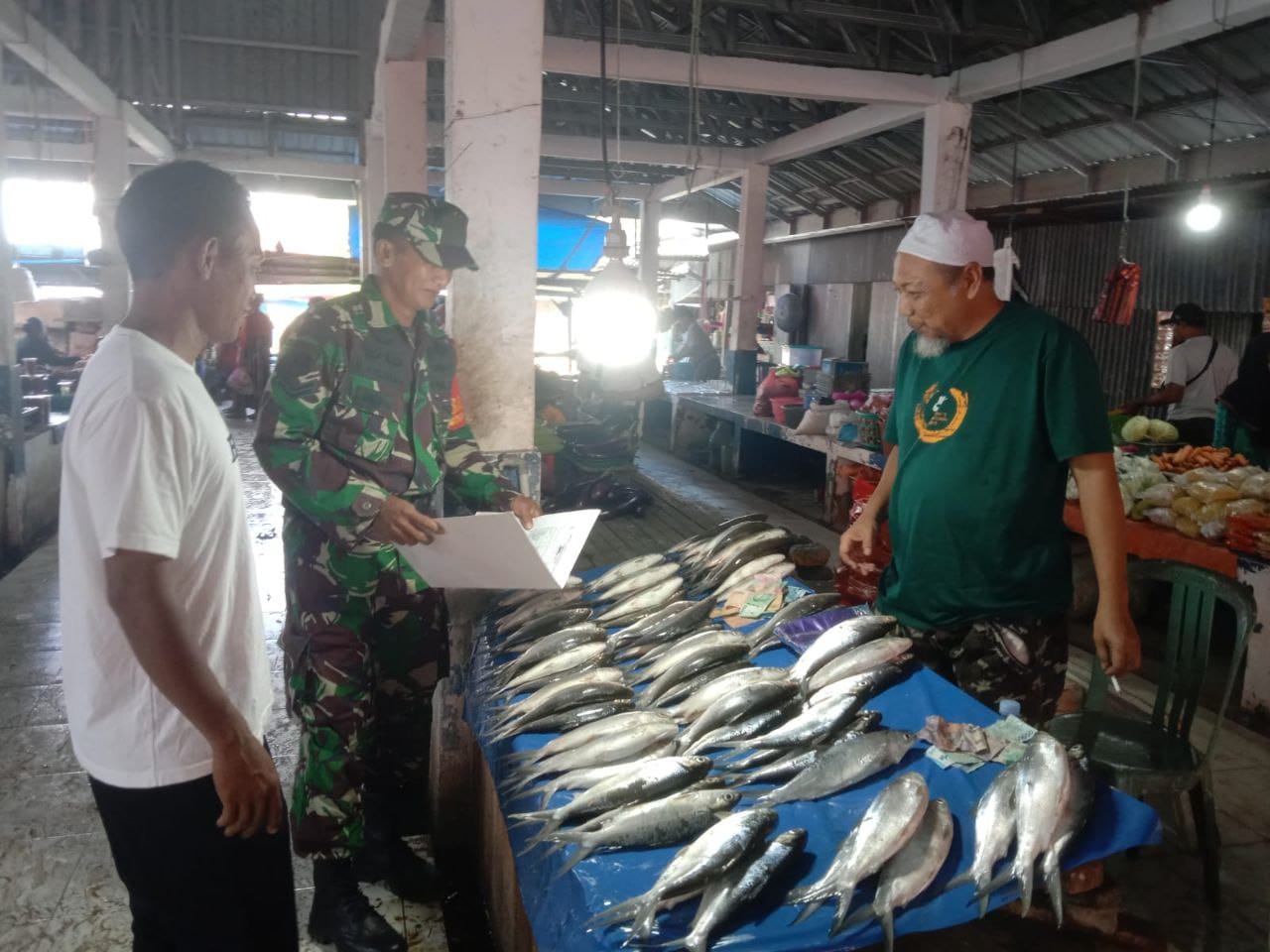 Di tengah kesibukan aktivitas pasar, Sertu Rusli terlihat berdialog dengan para pedagang dan warga yang berbelanja, sekaligus mencatat harga dan ketersediaan sejumlah bahan pokok penting.