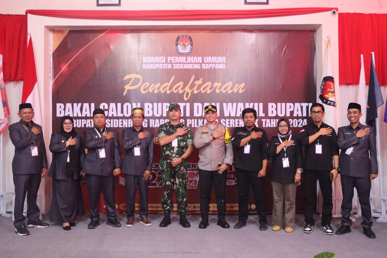 SIDRAP – Kapolres Sidrap, AKBP Dr. Fantry Taherong. SH.,S.I.K.,MH bersama Dandim 1420 Sidrap Letkol Inf. Awaloeddin kembali memantau langsung pengamanan proses pendaftaran Calon Bupati dan Wakil Bupati hari terakhir di Kantor Komisi Pemilihan Umum (KPU) Kabupaten Sidrap, Kamis (29/08/2024). Kegiatan yang dimulai sejak pagi hingga malam hari ini berjalan lancar dan kondusif berkat kesiapsiagaan seluruh personel Polres Sidrap bersama instansi terkait