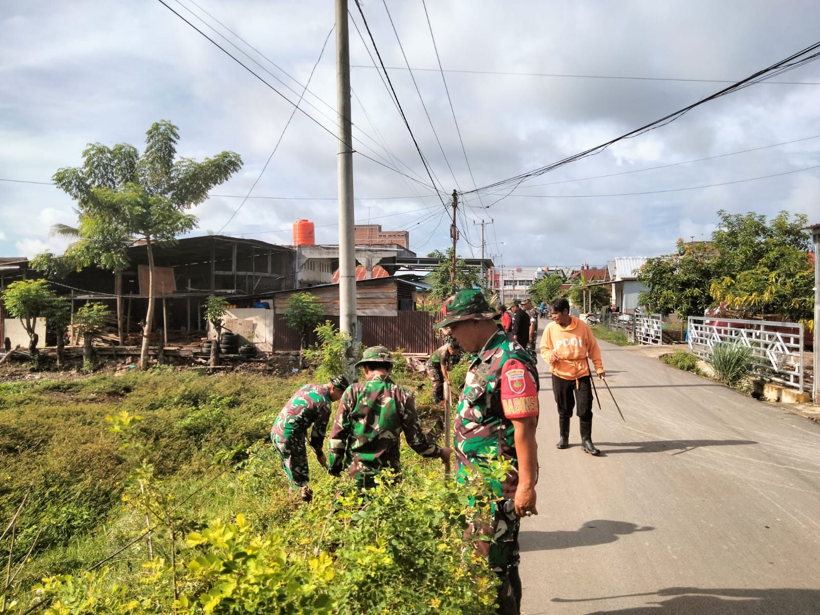 Dalam kegiatan Karya Bakti ini terlihat Danramil, Babinsa, bersama warga bahu membantu saling membantu untuk membersihkan rumput liar yang tinggi Dengan menggunakan Parang.