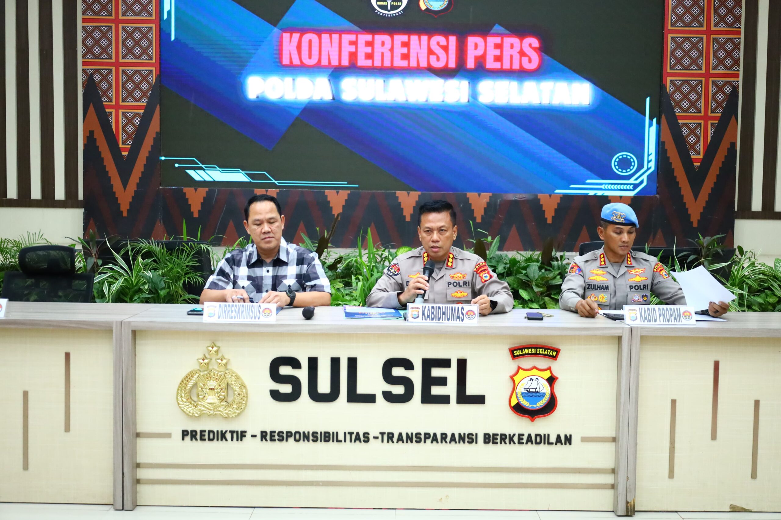 Direktorat Reserse Kriminal Khusus (Ditreskrimsus) Polda Sulawesi Selatan menggelar konferensi pers terkait perkembangan penanganan kasus penipuan online, Sabtu (26/4/2025), di Aula Mappaoddang, Mapolda Sulsel. Konferensi pers ini dipimpin oleh Dirkrimsus Polda Sulsel Kombes Pol Dedi Supriyadi, S.I.K., didampingi Kabid Humas Kombes Pol Didik Supranoto, S.I.K., M.H., dan Kabidpropam Kombes Pol Zulham Effendi, S.I.K., M.H.