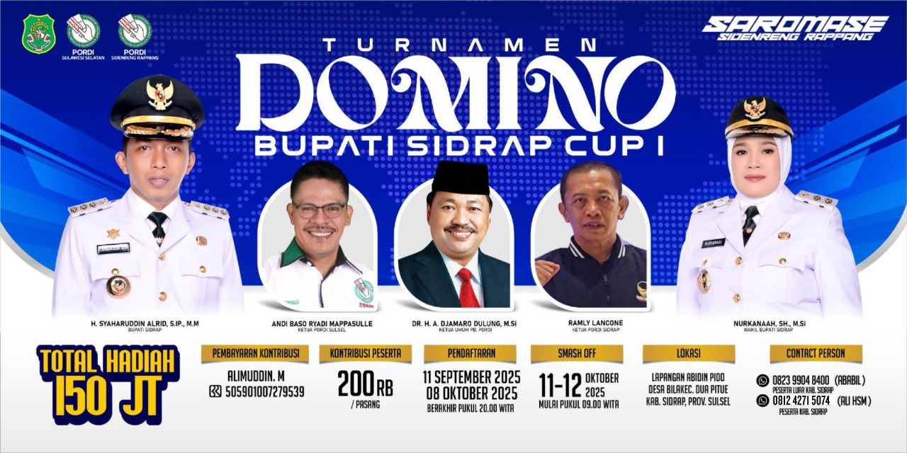 Sidrap – Kabar gembira untuk para penggemar domino! Turnamen *Domino Bupati Sidrap Cup I* siap digelar dengan hadiah total senilai 150 JUTA RUPIAH yang akan memperebutkan gelar juara! (10/10/2025)
